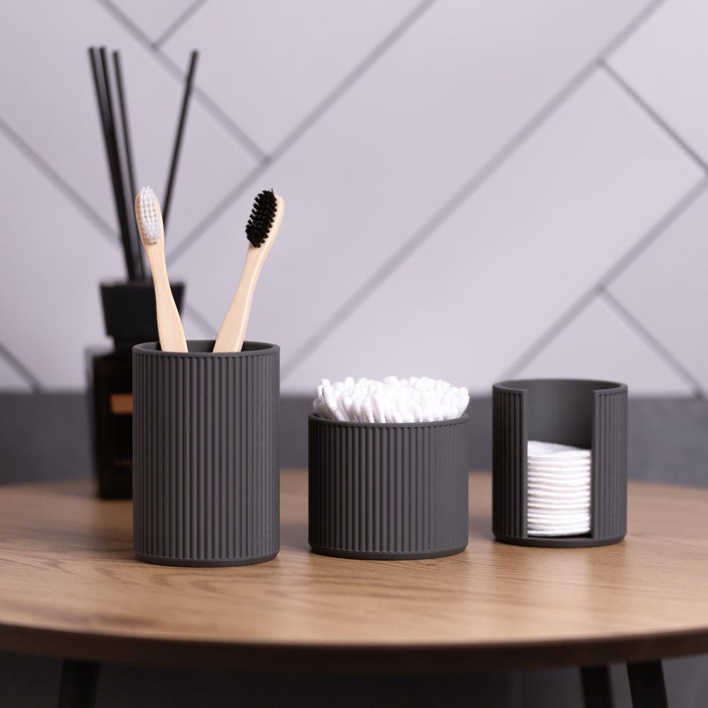Minimalist Dark Grey Bathroom Set – Graphite Grey | Modern Bathroom Organizer | Toothbrush Holder, Cotton Swab & Pad Dispenser