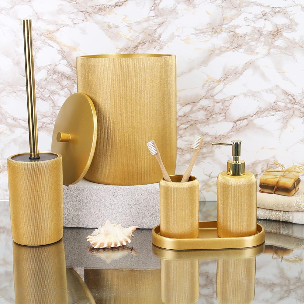 Rising Bathroom Accessory Sets with Trash Bin, Toilet Brush, Soap Dispenser, Toothbrush Holder, Tiny Tray / Bathroom Set in Gold Color