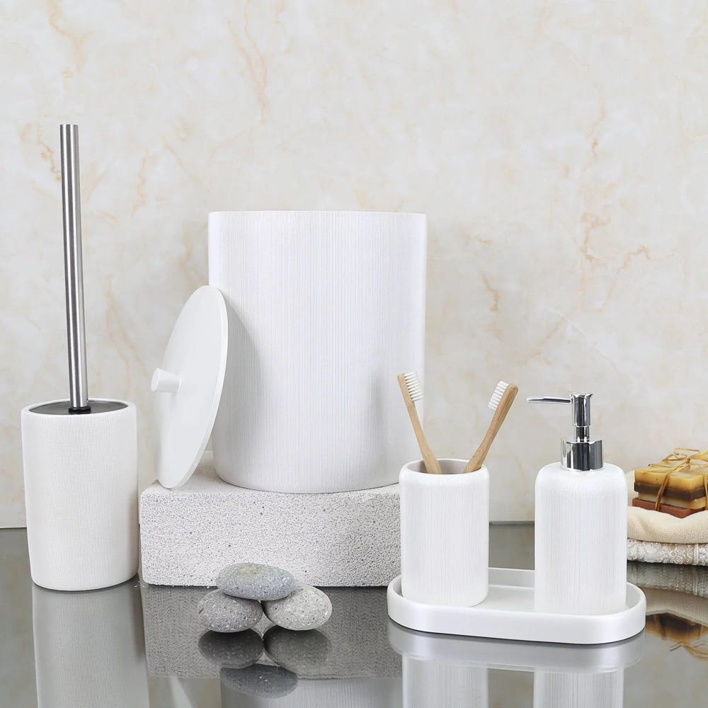 Rising Bathroom Accessory Sets with Trash Bin, Toilet Brush, Soap Dispenser, Toothbrush Holder, Tiny Tray / Bathroom Set in White Color