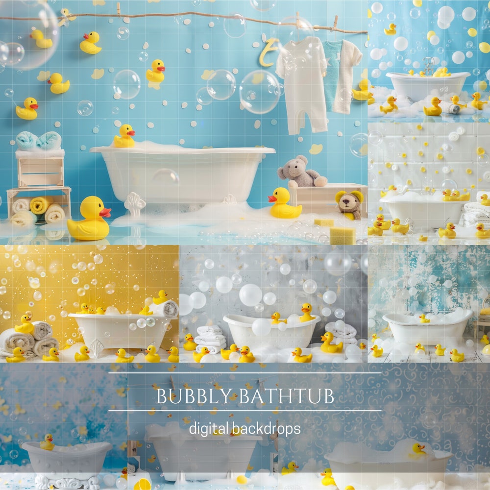 White Bathtub with Soap Bubbles and Yellow Rubber Ducks Digital Backdrops for Children Composite Photography, Studio Backdrop Overlays