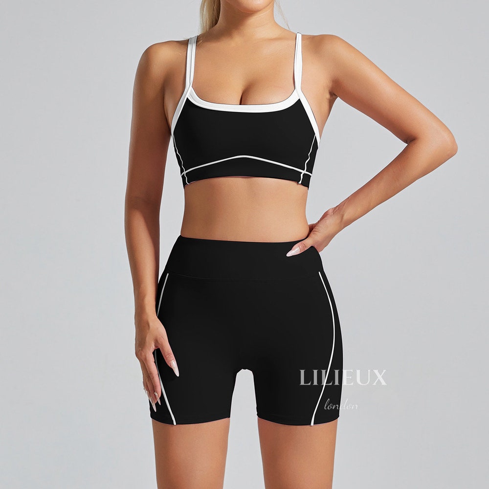 LILIEUX – 2 Piece Women’s Soft Active Sports Bra and High-Waisted Contrast-Trim Mini Shorts Set – for Yoga, Gym, and Fitness